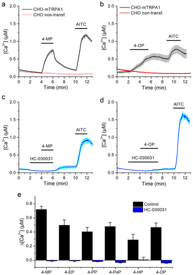 mTRPA1-mediated responses to alkylphenols. (a,b) Average traces of [Ca2+] recorded in CHO-mTRPA1 or non-transfected CHO cells showing the effects of 4-methylphenol (4-MP, 1300 µM, a) and 4-octylphenol (4-OP, 3.8 µM, b). (c,d) Average traces of [Ca2+] recorded in CHO-mTRPA1 cells showing the lack of effects of 4-methylphenol (4-MP, 1300 µM, c) and 4-octylphenol (4-OP, 3.8 µM, d) in the presence of TRPA1 inhibitor HC-030031 (50 µM). (e) Average [Ca2+] change induced by alkylphenols (APs) in the control condition and in the presence of HC-030031. APs were applied at concentrations of 1300, 110, 60, 38, 10, and 3.8 µM for 4-MP, 4-EP, 4-PP, 4-PeP, 4-HP, and 4-OP respectively. The data is represented as mean ± s.e.m. (n > 50).