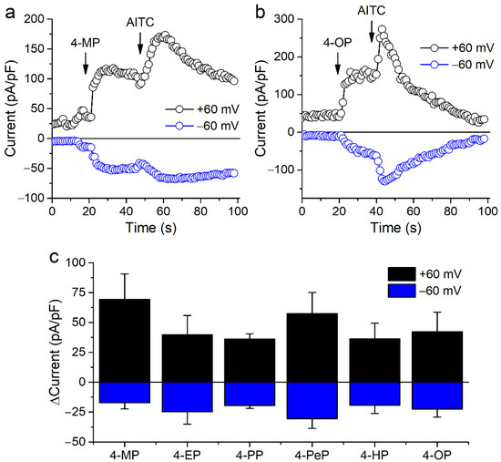 We further tested the effects of APs on mTRPA1 by performing whole-cell patch-clamp experiments in CHO-mTRPA1 cells. Extracellular application of APs increased inward and outward currents, and subsequent applications of AITC (100 µM) produced additional current stimulation (Figure 2a–c). As in the Ca2+ imaging experiments, higher concentrations of APs of shorter carbon chains were required for current stimulation.