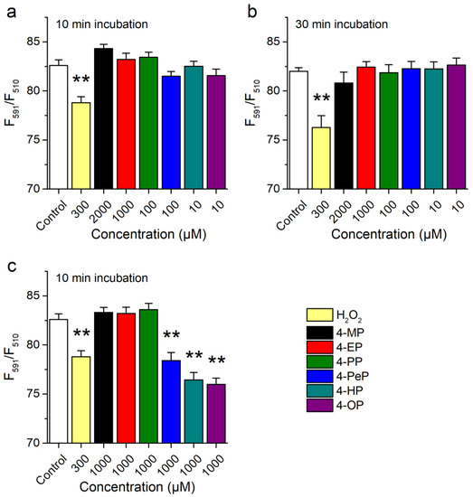 TRPA1 is activated by reactive oxygen species, such as H2O2 [12,41,42,43]. Thus, it could be envisaged that APs activate mTRPA1 by inducing oxidative stress. We assessed this possibility by testing if APs increase oxidation levels, using the Image-iT Lipid Peroxidation Kit that is based on the fluorescent reporter BODIPY 581/591 C11. The fluorescence of this reagent shifts from red to green upon oxidation, allowing for ratiometric determinations of lipid peroxidation. Treatments of CHO-mTRPA1 cells over 10 or 30 min with APs at concentrations activating mTRPA1 did not induce lipid peroxidation (Figure 3a,b). When tested at 1000 µM, only 4-PeP, 4-HP, and 4-OP induced significant lipid peroxidation (Figure 3c). As expected, H2O2 (300 µM) caused a significant oxidative stress (Figure 3c).