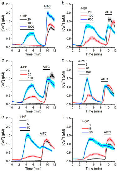 Cells were highly insensitive to 4-MP, as concentrations of 1000 µM or higher were required to elicit Ca2+ responses (Figure 5a). 4-EP was able to trigger responses already at 100 µM, but was ineffective at 20 µM (Figure 5b). 4-PP and 4-PeP were effective at 20 µM, but not at 5 µM (Figure 5c,d). 4-HP induced responses at 5 µM, but not at 1 µM (Figure 5e), whereas 4-OP did trigger responses at this concentration (Figure 5f).