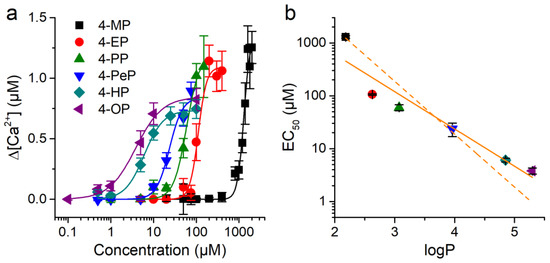 The plot of the average amplitude of the responses of CHO-mTRPA1 cells as a function of the concentration of the APs corroborates that the effects were concentration-dependent and illustrates difference in sensitivity of mTRPA1 for these compounds (Figure 6a). Each of these experimental data sets were fit with Hill functions, yielding the corresponding values for effective concentration, EC50. The EC50 is a decreasing function of logP of the compounds (Figure 6b).