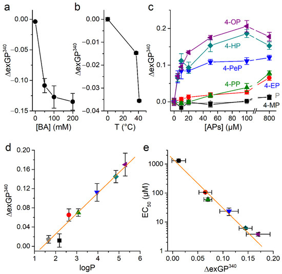 Treatment with each AP tested increased exGP340 in a concentration-dependent manner (Figure 7c), indicating that these compounds induce membrane ordering. However, the effectiveness to induce this effect strongly varied across compounds, with those with larger carbon chain (higher lipophilicity) being the most effective. For instance, 4-PeP, 4-HP, and 4-OP induced changes in exGP340 at the lowest concentration tested (5 µM, with p = 0.017, 0.01, 0.01, respectively, U test), whereas 4-PP and 4-EP required to be applied at 50 and 400 µM, respectively, for increases in this parameter to be significant (p = 0.01 and 0.04, respectively, U test). Furthermore, 4-MP and the non-alkylated form, phenol, only induced a significant increase in exGP340 when tested above 800 µM. In addition, the effects of 4-PeP, 4-HP, and 4-OP reached saturation for concentrations above ~50 µM, whereas this was not observed for any of the other compounds for concentrations up to 800 µM. The effects of APs on exGP340 can be represented as a function of the lipophilicity of the compounds (Figure 7d). This shows that the ability of APs to alter membrane order is a linear function of the lipophilicity, and that this dependency was concentration dependent.