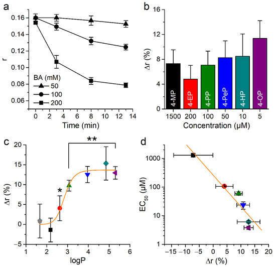 Effect of alkylphenols on the anisotropy of 1,6-diphenyl-1,3,5-hexatriene (DPH) fluorescence. (a) Time course of anisotropy changes induced by application of 50, 100, or 200 mM of BA. (b) Change in anisotropy (after 3 min pre-treatment) caused by near to EC50 for mTRPA1 concentrations of APs. All experiments were conducted in CHO-mTRPA1 cells stained with 10 µM DPH and measured at T = 37 °C using FlexStation III. The data is shown as mean ± s.e.m. from at least three experiments. (c) Relationship between changes in membrane fluidity induced by the phenol and its derivatives (all at 10 µM) and the calculated partition coefficient of these compounds. (* p < 0.05, ** p < 0.01, two-tailed Mann-Whitney U test). The orange line represents the fit with a Hill function with maximal amplitude 13.7 ± 0.9, midpoint 2.85 ± 0.09, and Hill coefficient 13 ± 5. (d) Relation between EC50 value and change in anisotropy induced by AP application. The orange line represents the fit with a linear function with a slope of −0.11 ± 0.01 µM (Pearson’s correlation coefficient 0.98, R2 = 0.96).