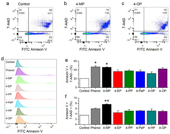 We further evaluated the effects on APs on plasma membrane properties using a FITC Annexin V Apoptosis Detection Kit with 7-amino-actinomycin D (7-AAD). Annexin V binds to the phosphatidylserine, which is only found on the intracellular leaflet of the plasma membrane in living cells. In conditions in which the membrane asymmetry is lost phosphatidylserine translocate to the external leaflet, allowing the binding of extracellularly applied Annexin V. On the other hand, 7-AAD can bind to DNA only upon disruption of the plasma membrane. Thus, labelling with Annexin V indicates membrane reordering, whereas with 7-AAD reports membrane disruption. We tested the effects of treatment with phenol at 1300 μM or with APs at their respective EC50 concentrations for mTRPA1 activation with fluorescence-activated cell sorting (FACS). About 20% of control (untreated) cells were Annexin V-positive/7-AAD-negative (Figure 9a,d,e) and less than 4% were Annexin V-positive/7-AAD-positive (Figure 9a,d,f). The proportion of Annexin V-positive/7-AAD-negative cells was higher in cells exposed to APs than in control cells (Figure 9b–e). The proportion of Annexin V-positive/7-AAD-positive was only higher than in control cells in cells treated with phenol and 4-MP (Figure 9b,d,f).
