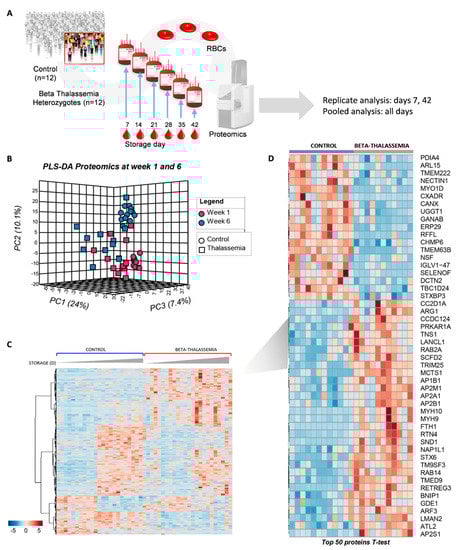 Proteomics analysis of the stored RBC membrane. (A) Isolated membranes from n = 12 βThal+ and n = 12 control RBC units were analyzed by proteomics tools in single replicates (day 7 and day 42 samples) or in pooled samples (days 7–42 at weekly intervals). (B) Principal component and discriminant analysis of day 7 and day 42 samples. (C) Heat map showing differentially expressed proteins between the two groups at early and late storage. (D) Heat map showing the top 50 proteins differing between βThal+ and control membranes at early storage.