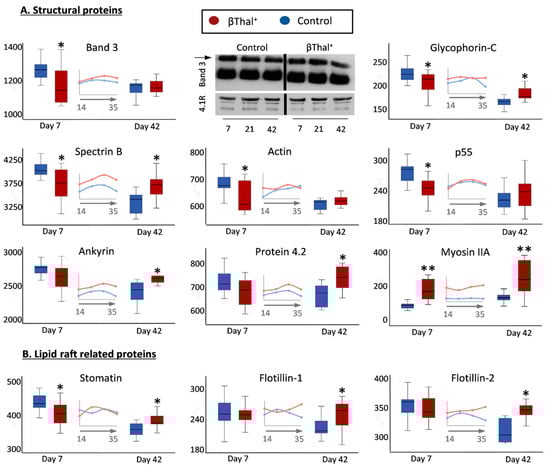 Proteomics analysis of stored RBC membrane: structural proteins. Levels of integral and peripheral membrane proteins (A) as well as of lipid raft-related components (B) in βThal+ and control RBCs throughout storage. Inserts: pooled analysis of membrane samples at weekly intervals. Representative immunoblots of band 3 monomers and dimers (arrow) are shown (n = 7). 4.1R protein was used as internal loading control. (*) p < 0.05 βThal+ vs. controls; (**) p < 0.05 and fold > 1.25 βThal+ vs. controls.