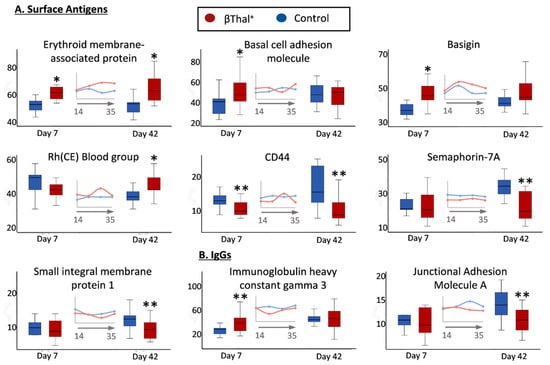 In the category of membrane proteins carrying blood group antigens, several components were increased (e.g., erythroid membrane-associated protein-ERMAP/Scianna blood group; basal cell adhesion molecule-BCAM/Lutheran antigen; basigin/Ok blood group; Rh-CE glycoprotein) or decreased (CD44, AnWj and In antigens; Semaphorin 7A, John-Milton Hagen blood group antigen; small integral membrane protein-1, SMIM/Vel blood group antigen) in βThal+ samples compared to the control (Figure 3A). With a few exceptions (e.g., IGHG3 Figure 3B), control levels of membrane-bound immunoglobulin proteoforms were detected in the stored βThal+ RBCs. Notably, the junctional adhesion molecule A (F11 receptor), a member of the immunoglobin superfamily and potential platelet receptor, was detected at lower levels in old stored βThal+ RBCs (Figure 3B).