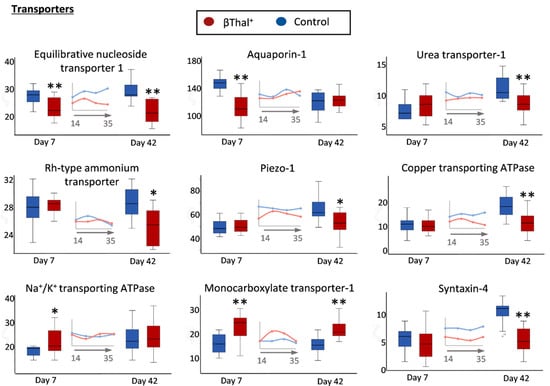 Proteomics analysis of stored RBC membrane: transporters, channels, and pumps. Levels of integral proteins involved in transport across the membrane in βThal+ and control RBCs throughout storage. Inserts: pooled analysis of membrane samples at weekly intervals. (*) p < 0.05 βThal+ vs. controls; (**) p < 0.05 and fold > 1.25 βThal+ vs. controls.