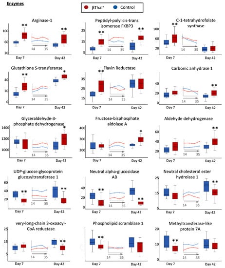 Proteomics analysis of stored RBC membrane: proteins with enzymatic activity. Levels of integral membrane enzymes or cytosolic membrane-bound enzymes in βThal+ and control RBCs throughout storage. Inserts: pooled analysis of membrane samples at weekly intervals. (*) p < 0.05 βThal+ vs. controls; (**) p < 0.05 and fold > 1.25 βThal+ vs. controls.