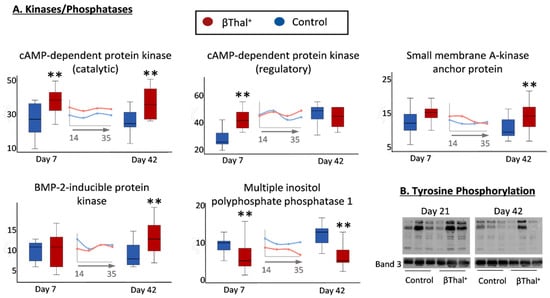 It is worth mentioning that, while several cytosolic kinases exhibited higher membrane binding in the βThal+ stored RBCs, the phosphatases demonstrated the opposite trend (Figure 6A). Consequently, higher protein tyrosine phosphorylation was detected by immunoblotting analysis in the βThal+ RBC membrane compared to the control at middle and late storage (Figure 6B).