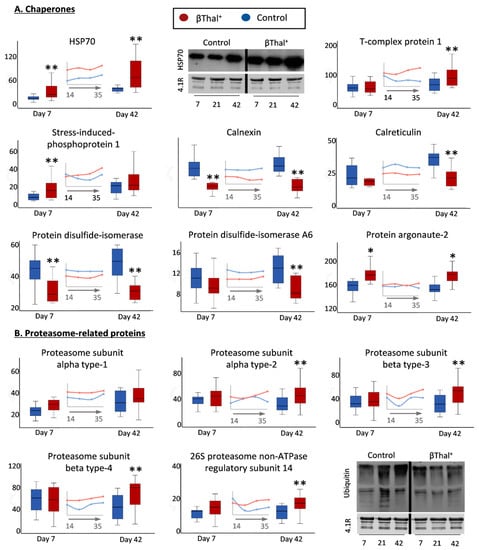 Several deregulated proteins in βThal+ RBCs fall in the group of molecular chaperones, proteasome proteins, redox regulators, and free radical scavengers, reflecting proteotoxic stress and activated antioxidant defense. Among these, glutathione transferase, flavin reductase, and aldehyde dehydrogenase were included. The potentially toxic unstable free α-globin chains in βThal+ RBCs can be eliminated by functionally interconnected protein quality control pathways []. It has been suggested that chaperones may be involved in α-globin refolding or targeting for degradation to proteasome [,,,], and, consequently, numerous molecular chaperones are upregulated in βThal+ trait erythroblasts in mice.