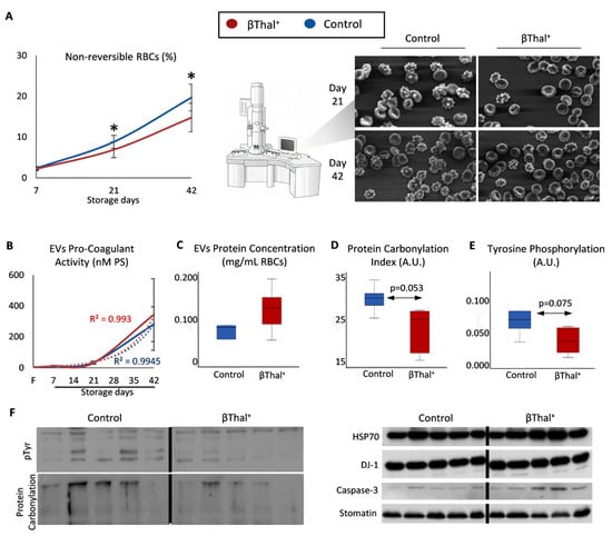 We then examined whether the abovementioned variation of the RBC membrane proteome was associated with typical storage-induced changes in cellular shape and the degree of membrane vesiculation. To this purpose, we first proceeded to a morphological evaluation of stored RBCs by scanning electron microscopy. Lower levels of irreversible shape modifications (e.g., spherocytes) were observed in βThal+ vs. the control units at middle and late storage (Figure 8A). Following sequential isolation of supernatants and then of EVs accumulated into them up to late storage, we found equal levels of procoagulant activity (Figure 8B), but a slightly higher (p = 0.198) concentration of total vesicular proteins per volume unit of packed RBCs (Figure 8C). Of note, a trend (p = 0.053–0.150) for lower levels of post-translational modifications, such as protein carbonylation and phosphorylation (Figure 8D–F, left panel), but overexpression of molecular chaperones (e.g., HSP70, DJ-1) and caspase-3 (Figure 8F, right panel), was detected by immunoblotting in EVs collected from βThal+ units compared to the control.