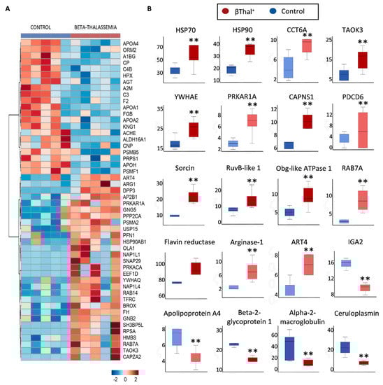 Proteomics analysis of storage EVs. (A) Heat map for proteins differing between βThal+ and control vesicles (n = 5 per group). (B) Representative boxplots showing statistically significant variation in the levels of specific EV proteins between the two groups. Light and dark colors indicate proteins of low and high abundance, respectively. (**) p < 0.05 and fold > 1.25 βThal+ vs. controls. Abbreviations: CCT6A: T-complex protein 1 subunit zeta; TAOK3: serine/threonine-protein kinase; YWHAE: 14-3-3 protein epsilon; PRKAR1A: cAMP-dependent protein kinase type I-alpha regulatory subunit; CAPNS1: calpain small subunit 1; PDCD6: programmed cell death protein 6; ART4: ecto-ADP-ribosyltransferase 4; IGA2: immunoglobulin alpha-2 heavy chain.