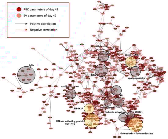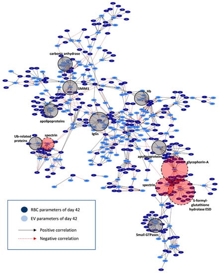 More than 1000 statistically significant (p < 0.01) correlations were detected in the control (~1000) and βThal+ (~1350) RBC-EV networks (Figure 10 and Figure 11, respectively; Table S6). Variation in the RBC membrane-bound small GTPases (90 vs. 140 connections, βThal+ vs. control), proteasome subunits, activators (but not ubiquitin-related proteins; 163 vs. 100 connections, βThal+ vs. control), and IgGs (70 vs. 28 connections, βThal+ vs. control, respectively) were more interconnected to the target EV phenotypes that are common (e.g., RBC IgGs connections to EV Hb, acetylcholinesterase, and superoxide dismutase) or different between groups (e.g., RBC proteasome connections to Hb concentration exclusively in βThal+ EVs) (Table S7). Even though the chaperone proteoforms prevailed in the RBC membrane over proteasome subunits, the latter were significantly more interconnected to EV features, including EV Hb, complement, redox metabolism, and protein tyrosine phosphorylation. Binding of small GTPases to the RBC membrane was further related to the vesicular content of heat shock proteins, IgGs and Alix in both groups, but also with the caspase 3 and total EV protein concentration in βThal+ units. Finally, the IgGs load of the membrane in the stored RBCs was strongly connected to the peroxiredoxin protein kinases and protein tyrosine phosphorylation levels in βThal+ units.