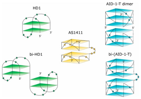 GQs have a well-documented anti-proliferative activity []. Besides the numerous attempts at searching for more GQs with anti-proliferative activity, there are three established arms of research, which are based on the original mono-modular GQs, namely, AS1411, HD1, and the so called T-series.