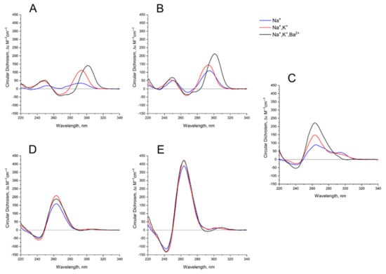 GQ folding and stability strongly depend on the concentration and nature of the cations in a buffer [,,]. Sodium cation Na+ is for a shielding the phosphate charges; potassium cation K+ is a very critical stabilizer of GQ structure, because it coordinates the octet of oxygen atoms of G-tetrads, and stabilizes GQ. Finally, barium cation Ba2+ is a very special coordination center, which arranges the same donors, the oxygen atoms of G, but much more strongly, and usually yielding a slightly different structure of GQ complex, unlike the one with K+ that could be clearly detected by CD spectroscopy [].