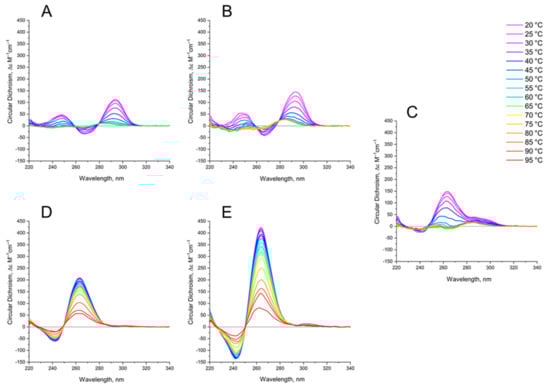 CD spectra of GQs under study in buffer C (140 mM NaCl, 10 mM KCl, 5 mM BaCl2) at different temperatures: (A) HD1, (B) bi-HD1; (C) AS1411, (D) AID-1-T, (E) bi-(AID-1-T). The color ladder on the right indicates temperatures.