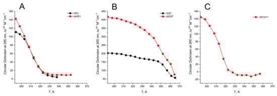 CD melting profile of GQs under study in buffer B (140 mM NaCl and 10 mM KCl): (A) HD1 (black), bi-HD1 (red); (B) AID-1-T (black), bi-(AID-1-T) (red); (C) AS1411 (red). Temperature is in kelvin (K): [°C] = [K] − 273.