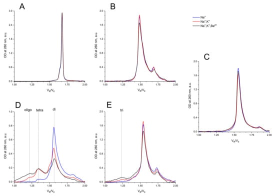 Size exclusion HPLC chromatography analysis of GQs under study: in buffer A (140 mM NaCl; (Na+), blue), in buffer B (140 mM NaCl, 10 mM KCl; (Na+, K+), red), in buffer C (140 mM NaCl, 10 mM KCl, 5 mM BaCl2; (Na+, K+, Ba2+), black) at 20 °C: (A) HD1, (B) bi-HD1, (C) AS1411, (D) AID-1-T, (E) bi-(AID-1-T).