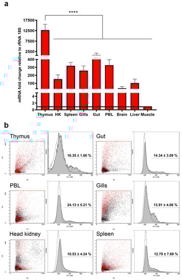 - Picchietti, S.; Guerra, L.; Buonocore, F.; Randelli, E.; Fausto, A.M.; Abelli, L. Lymphocyte Differentiation in Sea Bass Thymus: CD4 and CD8-α Gene Expression Studies. Fish Shellfish Immunol. 2009, 27, 50–56. [Google Scholar] [CrossRef]