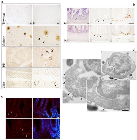 - Picchietti, S.; Guerra, L.; Selleri, L.; Buonocore, F.; Abelli, L.; Scapigliati, G.; Mazzini, M.; Fausto, A.M. Compartmentalisation of T Cells Expressing CD8α and TCRβ in Developing Thymus of Sea Bass Dicentrarchus labrax (L.). Dev. Comp. Immunol. 2008, 32, 92–99. [Google Scholar] [CrossRef] [PubMed]
