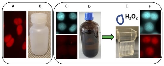 Since its first description, the anti-La mAb 7B6 was used in different labs. While it reliably worked in ELISA and Western blotting experiments, controversial results were reported for IF studies. The reason for these discrepancies remained unclear for many years. The first evidence came by chance: We used the anti-La mAb 7B6 to teach medical students how to perform IF microscopy. For that purpose, several hundred coverslips were prepared, fixed with methanol, and stained in parallel. Usually, we store the methanol for fixation in plastic bottles. In this case, the amount of methanol was not sufficient for the fixation of all coverslips. Therefore, a minor portion of the coverslips was fixed using methanol of analytical grade that was taken from a freshly opened dark brown glass bottle. As expected, human cells fixed with methanol stored in plastic bottles gave nuclear staining in IF microscopy (Figure 2A,B). However, the same batch of mAb failed to stain fixed cells (Figure 2C, lower panel) if the methanol for fixation was taken from a freshly opened dark brown glass bottle (Figure 2D). Bearing in mind the reported sensitivity of the La protein fragment to oxidation [21,22,23], we speculated that the methanol stored in the plastic bottle could contain, e.g., peroxides or oxygen radicals, which may be absent in the methanol of analytical grade stored in the dark and in the brown glass bottle. Indeed, when the same coverslips that failed in the first staining round were shortly rinsed with PBS, to which hydrogen peroxide was added (Figure 2E), the staining could be restored (Figure 2F, lower panel). Already a single drop of hydrogen peroxide solution added to 15 mL PBS (equivalent to about 30 μM H2O2) in the staining chamber was sufficient.