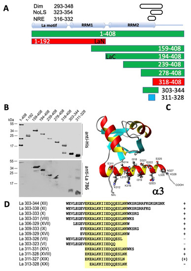The epitope recognized by the anti-La mAb 7B6 is part of the predicted dimerization domain (Dim), nuclear retention element (NRE) and nucleolar localization signal (NoLS). (A) A series of deletion mutants, which were truncated from either the N- or the C-terminus or from both sites, were cloned as His-tagged fusion proteins, expressed in E. coli and isolated by nickel affinity chromatography. (B) The deletion mutants were tested against either anti-His Abs (upper panel) or the anti-La mAb 7B6 (lower panel). Results for selected deletion mutants are shown, including the identified epitope sequence aa311-328 (EKEALKKIIEDQQESLNK). (C) The epitope sequence consists of most of the α3-helix in the RRM2 plus 3 aa (LNK) of the unstructured region located C-terminally of the α3-helix (see also Figure 1). (D) Besides the deletion mutants shown in (A,B), a series of further fragments related to the epitope sequence recognized by the anti-La mAb 7B6 were prepared and tested, which finally helped us to locate the epitope recognized by the anti-La mAb 7B6 to the aa311-328.