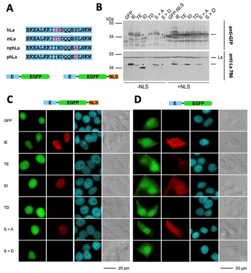 The human 7B6 epitope sequence EKEALKKIIEDQQESLNK (Figure 4A, hLa) differs from the murine epitope sequence EKEALKKITDDQQESLNK (Figure 4A, mLa) with respect to the two aa (IE > TD) highlighted in red. As the murine La protein expressed in E. coli reacts with the anti-La mAb 7B6, while the murine La protein expressed in eukaryotic cells fails to react, we assume that one or both aa residues (TD) undergo posttranslational modification(s) in mouse cells. In order to confirm this assumption, we cloned N-terminally tagged 7B6 epitope/enhanced green fluorescent protein (EGFP) fusion proteins with (Figure 4A, E-EGFP-NLS) and without a C-terminal nuclear localization signal (Figure 4A, E-EGFP). The resulting constructs were transfected into either human HEK293 cells and analyzed by SDS–PAGE and immunoblotting (Figure 4B) or human HeLa cells and analyzed by IF microscopy (Figure 4C,D). As a negative control, we used EGFP and the respective EGFP-NLS vector lacking the N-terminal epitope sequence. As summarized in Figure 4B–D the data obtained by both techniques for the different human cell lines are comparable, indicating that the results do neither depend on the cell line nor the different analytical techniques.