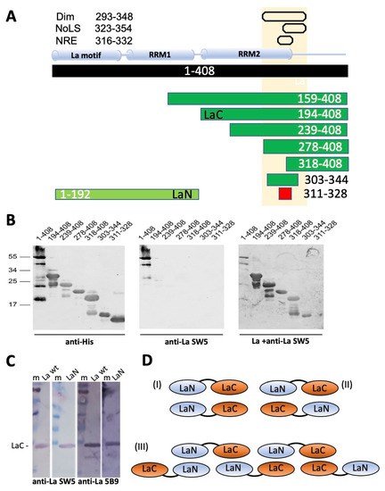 Almost five decades ago, autoantibodies to the autoantigens La and Ro, also known as Sjögren’s syndrome associated antigen B (SS-B) and SS-A, were first detected in sera of patients suffering from primary Sjögren’s syndrome (pSS) or systemic lupus erythematosus (SLE) [1,2]. Since then, a series of in part controversial data was published about the structure, function and localization of both autoantigens. As part of the diagnosis, sera of patients are commonly analyzed for the presence of anti-nuclear antibodies (ANAs) using immunofluorescence (IF) microscopy. According to these countless microscopical analyses, there is certainly no doubt about a nuclear localization of La protein [3]. Nuclear localization is also in good agreement with the described nuclear function(s) of La protein in the context of primary RNA polymerase III transcripts [4,5,6,7,8,9]. Besides these nuclear functions, however, it was published that La protein may play an additional role in the cytoplasmic compartment: It was shown that La protein is involved in Cap-independent translation of viral and cellular mRNAs harboring internal ribosomal entry sites (IRES elements) [8,9,10,11,12,13]. Using Far-Western blotting, Craig et al. identified a dimerization domain in La protein and showed experimental evidence that dimerization is required for La protein’s function in IRES-dependent translation [14]. The dimerization element was identified in the C-terminal domain of La protein between amino acids (aa) 293–348. Later, a nuclear retention element (NRE) and a nucleolar localization signal (NoLS) were identified inside of the same region [15,16] (Figure 1A, and also below).