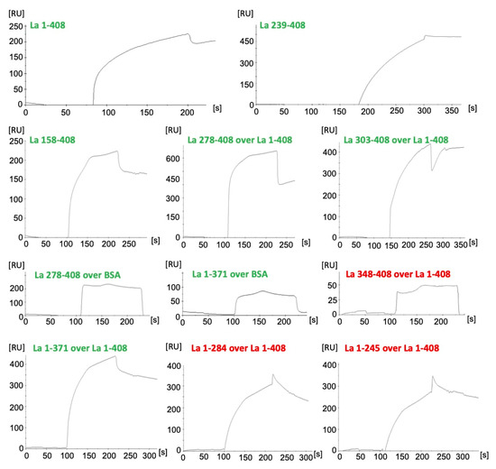 In order to rule out that denaturing of La-related fragments may allow interactions with hydrophobic regions [15], we decided to confirm the Far-Western blotting data by surface plasmon resonance (SPR) studies (Figure 6). For this purpose, full-length human La protein (La1-408) was covalently linked to a sensor plate. Bovine serum albumin served as control (Figure 6, BSA). Sensograms for selected La protein deletion mutants are shown in Figure 6: All La fragments containing the Dim domain are highlighted in green. All La fragments lacking the Dim domain are highlighted in red. As shown in Figure 6, native full-length La protein (La 1–408) binds to full-length La protein confirming the protein–protein interaction. Moreover, the N-terminally truncated fragments La 158–408, La 239–408, La 278–408, La 303–408 (all containing the Dim domain) nicely bind to full-length La protein. In contrast, the La fragment La 348–408 starting C-terminally of the Dim domain fails to bind. These protein–protein interactions should be specific as the fragments do not bind to BSA, as shown in Figure 6 for the La deletion mutants La 278–408 and La 1–371, both containing the Dim domain. As also found by the Far-Western blotting experiment, both C-terminally truncated La deletion mutants containing (La 1–371) or lacking the Dim domain (La 1–284, and La 1–245) are capable of protein–protein interactions.