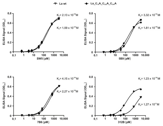 The redox-dependency of these antibodies also becomes obvious from the apparent KD values as estimated by ELISA for the oxidized (Figure 10, wild-type La, triangle) and reduced form (Figure 10, triple cysteine mutant, square) of La protein. While we estimated no dramatic difference between the KD values to the oxidized and reduced form of La protein for the anti-La mAbs SW5, 5B9 and 7B6, there is a dramatic difference for the anti-La mAb 312B. We estimated for all mAbs KD values around 10−10 M to the reduced form of La protein and similar KD values to the oxidized form of La protein for the anti-La mAbs SW5, 5B9 and 7B6. However, the KD value of the anti-La mAb 312B to the oxidized form of La protein is about 10-fold lower (around 10−9 M). According to these data, it should be possible to compensate for the dramatically reduced binding of the anti-La mAb 312B to the oxidized La form by increasing the concentration of oxidized La protein about 10-fold.