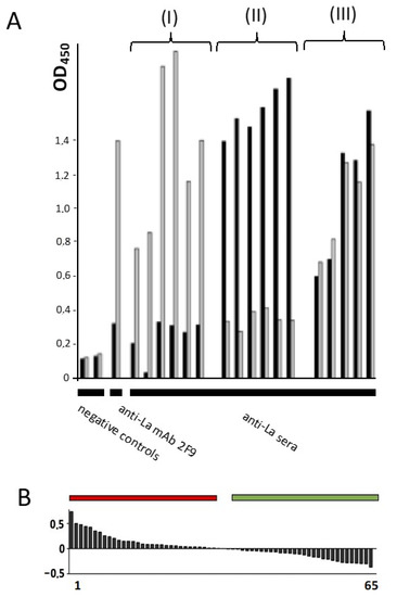 Comparison of the reactivity of patient’s anti-La sera against oxidized versus reduced La protein. Wild-type La protein was coated to ELISA plates. Prior to ELISA, La protein was either treated with H2O2 (black bars) or DTT (gray bars). Oxidoreduction was verified by the anti-La mAb 2F9. (A) Tested sera were grouped into three categories: (I) sera, which preferentially react with the reduced form of La protein, (II) sera, which preferentially react with the oxidized form of La protein, (III) sera, which do not show major differences in dependence on oxidoreduction. (B) Until now, 64 anti-La positive patient sera were tested for a differential reactivity to either the oxidized or reduced form of La protein. The sera were sorted for their preferential reactivity against either the oxidized (red bar) or reduced form of La protein (green bar). Each black bar represents one serum.