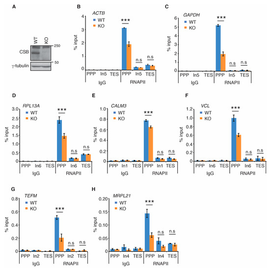 Loss of CSB impairs RNAPII occupancy at PPP sites. (A) Western analysis of U2OS CSB-WT and CSB-KO cells. Immunoblotting was performed with anti-CSB and anti-γ-tubulin antibodies. The γ-tubulin blot was used as a loading control in this and subsequent figures. (B–H) RNAPII ChIP analyses of ACTB, GAPDH, RPL13A, CALM3, VCL, TEFM and MRPL21 genes in U2OS CSB-WT and CSB-KO cells. Standard errors from three independent experiments are shown. p values were derived using the 2-way ANOVA test. *** p < 0.001, n.s.: not significant. Abbreviations used in this and subsequent figures—PPP: promoter proximal pause site; ln: intron; TES: transcription end site.