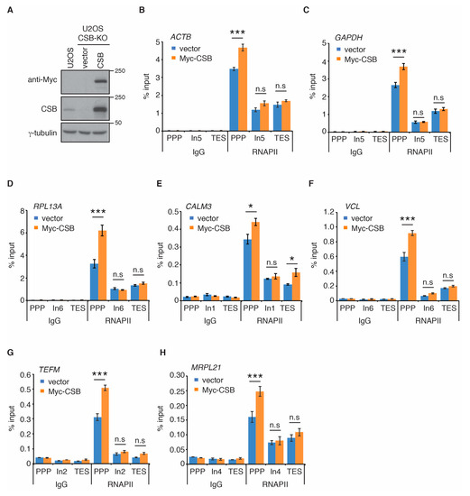 Re-introduction of wild type CSB rescues RNAPII occupancy at PPP sites. (A) Western analysis of U2OS cells as well as U2OS CSB-KO cells complemented with the vector alone or Myc-CSB. Immunoblotting was performed with anti-Myc, anti-CSB, and anti-γ-tubulin antibodies. (B–H) RNAPII ChIP analyses of ACTB, GAPDH, RPL13A, CALM3, VCL, TEFM and MRPL21 genes in U2OS CSB-KO cells expressing the vector alone or Myc-CSB. Standard errors from three independent experiments are shown. p values were derived using the 2-way ANOVA test. * p < 0.05; *** p < 0.001, n.s.: not significant.