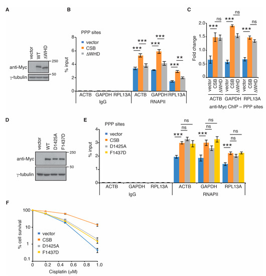 The CSB-WHD mediates RNAPII occupancy at PPP sites in a manner independent of its ability to bind to ubiquitin. (A) Western analysis of U2OS CSB-KO cells expressing the vector alone, Myc-CSB WT or Myc-CSB-∆WHD. Immunoblotting was performed with anti-Myc and anti-γ-tubulin antibodies. (B) RNAPII ChIP analyses of ACTB, GAPDH and RPL13A genes in U2OS CSB-KO cells complemented with the vector alone, Myc-CSB WT or Myc-CSB-∆WHD. Standard errors from three independent experiments are shown. p values were derived using the 2-way ANOVA test. *** p < 0.001; ** p < 0.01; ns: p > 0.05. (C) Anti-Myc ChIP analyses of of ACTB, GAPDH and RPL13A genes in U2OS CSB-KO cells complemented with the vector alone, Myc-CSB WT or Myc-CSB-∆WHD. Standard errors from three independent experiments are shown. p values were derived using the 2-way ANOVA test. *** p < 0.001; ns: p > 0.05. (D) Western analysis of U2OS CSB-KO cells expressing the vector alone, Myc-CSB WT, Myc-CSB-D1425A or Myc-CSB-F1437D. Immunoblotting was performed with anti-Myc and anti-γ-tubulin antibodies. (E) RNAPII ChIP analyses of ACTB, GAPDH and RPL13A genes in U2OS CSB-KO cells complemented with the vector alone, Myc-CSB WT, Myc-CSB-D1425A or Myc-CSB-F1437D. Standard errors from three independent experiments are shown. p values were derived using the 2-way ANOVA test. *** p < 0.001; ns: p > 0.05. (F) Cisplatin clonogenic survival assays of U2OS CSB-KO cells complemented with the vector alone, Myc-CSB WT, Myc-CSB-D1425A or Myc-CSB-F1437D. Standard deviations from three independent experiments are indicated.
