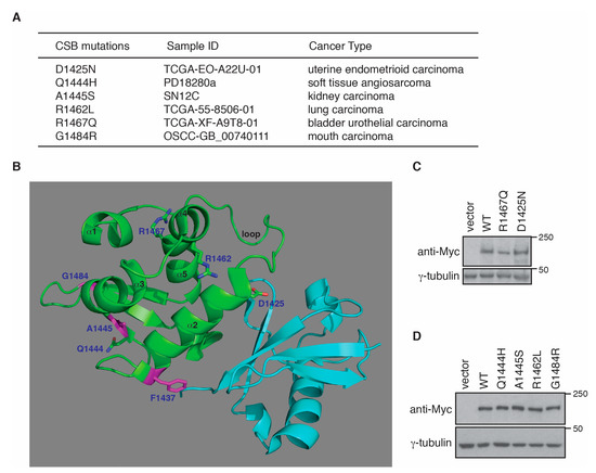 Cancer-associated CSB mutations in the CSB-WHD have little effect on CSB expression. (A) Six cancer-associated CSB mutations taken from both BioPortal and COSMIC databases. (B) Cartoon representation of the structure of the CSB-WHD in complex with ubiquitin (PDB code 6A6I). The CSB-WHD is coloured green, and ubiquitin is coloured cyan. Sidechains for D1425, F1437, Q1444, A1445, R1462, R1467 and G1484 are shown in stick representation, with nitrogen and oxygen atoms coloured in blue and red, respectively. Sidechains of F1437 and A1445, along with the position of G1484 on the cartoon backbone, are coloured magenta. For the CSB-WHD, α helices are numbered, and the N-terminal loop is identified. The figure was generated using PyMOL (www.pymol.org, accessed on 10 February 2021). (C) Western analysis of U2OS CSB-KO cells expressing the vector alone, Myc-CSB WT, Myc-CSB-R1467Q or Myc-CSB-D1425N. Immunoblotting was performed with anti-Myc and anti-γ-tubulin antibodies. (D) Western analysis of U2OS CSB-KO cells expressing the vector alone, Myc-CSB WT, Myc-CSB-Q1444H, Myc-CSB-A1445S, Myc-CSB-R1462L or Myc-CSB-G1484R. Immunoblotting was performed with anti-Myc and anti-γ-tubulin antibodies.