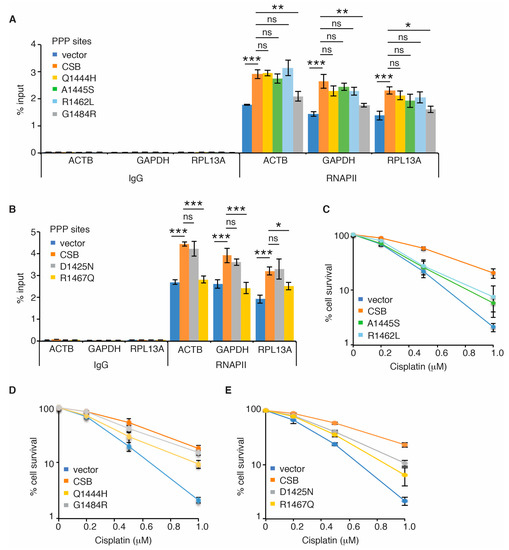 Cancer-associated R1467Q and G1484R mutations of CSB impair RNAPII pausing at PPP sites. (A) RNAPII ChIP analyses of ACTB, GAPDH and RPL13A genes in U2OS CSB-KO cells expressing the vector alone, Myc-CSB WT, Myc-CSB-Q1444H, Myc-CSB-R1462L, Myc-CSB-R1467Q or Myc-CSB-G1484R. Standard errors from three independent experiments are shown. p values were derived using the 2-way ANOVA test. * p < 0.05; ** p < 0.01; *** p < 0.001; ns: p > 0.05. (B) RNAPII ChIP analyses of ACTB, GAPDH and RPL13A genes in U2OS CSB-KO cells expressing the vector alone, Myc-CSB WT, Myc-CSB-D1425N or Myc-CSB-R1467Q. Standard errors from three independent experiments are shown. p values were derived using the 2-way ANOVA test. * p < 0.05; ** p < 0.01; *** p < 0.001; ns: p > 0.05. (C) Cisplatin clonogenic survival assays of U2OS CSB-KO cells expressing the vector alone, Myc-CSB WT, Myc-CSB-A1445S or Myc-CSB-R1462L. Standard deviations from three independent experiments are indicated. (D) Cisplatin clonogenic survival assays of U2OS CSB-KO cells expressing the vector alone, Myc-CSB WT, Myc-CSB-Q1444H or Myc-CSB-G1484R. Standard deviations from three independent experiments are indicated. (E) Cisplatin clonogenic survival assays of U2OS CSB-KO cells expressing the vector alone, Myc-CSB WT, Myc-CSB-D1425N or Myc-CSB-R1467Q. Standard deviations from three independent experiments are indicated.
