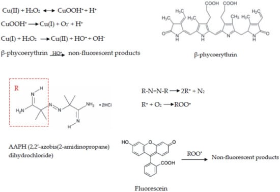 A series of fluorescent materials were described and proposed as samples in the ORAC test. Initially, the protein isolated from Porphyridium cruentum, β-phycoerythrin, was used as the fluorescent probe, which reacts with ROO• to form a non-fluorescent product. However, the use of β-phycoerythrin in antioxidant assays has shortcomings for some reasons: