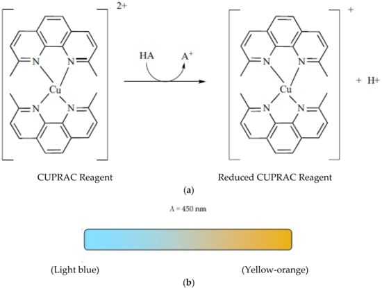 Reaction scheme involved in Cupric Reducing Antioxidant Power (CUPRAC) assay. HA represents an antioxidant molecule and A+ an oxidised antioxidant molecule (a); Colour change in the assay (b).