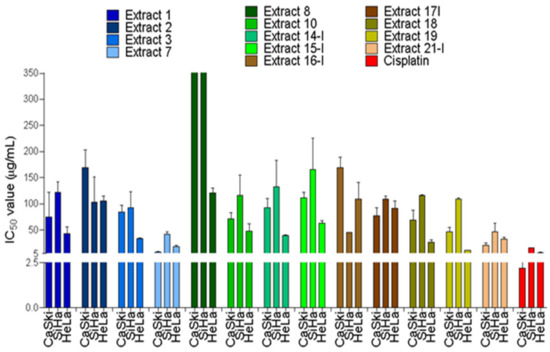 Effect of different natural crude extracts on viability of cervical cancer cell lines. Cellular viability was measured at 72 h by MTS assay. The results were expressed as the mean percentage ± SD of viable cells relatively to the DMSO alone (viability considered to be 100%). The half-maximal inhibitory concentration (IC50) concentrations were calculated by nonlinear regression analysis using Graphpad Prism software. Data represent the mean of at least two independent experiments performed in triplicate. Concentrations of crude extracts ranged from 2.5 to 300 µg/mL. Cisplatin concentrations ranged from 0.12 to 30 µg/mL.