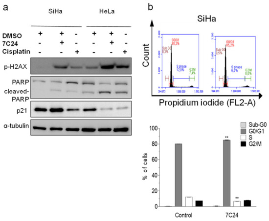 Fraction 7C24 and cell processes (DNA damage, apoptosis, and cell cycle) in SiHa and HeLa cell lines. SiHa and HeLa cells were treated with 7C24 (IC50 33.88 and 15.96 µg/mL, respectively) and cisplatin (13.01 and 9.36 µg/mL, respectively). Western blotting for phospho-H2AX, PARP, and p21 after 24 h of treatment (a). Flow cytometry of SiHa 24 h after 7C24 treatment, mean ± SD of two independent experiments (b). C + (present),—(absent). ** p < 0.01.