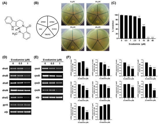 Figure 1. Anti-bacterial activity of evodiamine against H. pylori and downregulation of replication and transcription genes of H. pylori. (A) Chemical structure of evodiamine. (B) The MIC of evodiamine against five H. pylori reference strains (ATCC 49503, ATCC 43504, ATCC 51932, ATCC 700392 and SS1) was determined by agar dilution method. (C) The MIC of evodiamine against H. pylori ATCC 49503 strain was confirmed by broth dilution method. Optical density of bacterial broth was measured at 600 nm wavelength by spectrophotometry. H. pylori was treated with indicated concentrations of evodiamine (0.5 and 1 μM) for 72 h. RNA was subjected to RT-PCR to detect the mRNA expression levels of (D) replication machineries (dnaA, dnaB, dnaE, dnaN, dnaQ and gyrA) and (E) transcription machineries (rpoA, rpoB, rpoD and rpoN). The expression of efp was used as an internal control. (F) Each band intensity was normalized to efp. Data are presented as mean ± SEM of three independent experiments and analyzed by Student’s t-test (** p < 0.01 and *** p < 0.001).