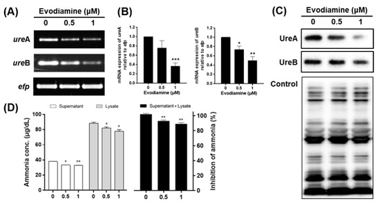 Figure 2. The inhibitory effects of evodiamine on the expression and activity of urease in H. pylori. (A) H. pylori was treated with indicated concentrations of evodiamine (0.5 and 1 μM) for 72 h. RNA was subjected to RT-PCR to detect the mRNA expression levels of urease subunits (ureA and ureB). The expression of efp was used as an internal control. (B) Each band intensity was normalized using to efp. (C) The cell lysates were subjected to Western blot to detect UreA and UreB. The rabbit anti-H. pylori polyclonal antibody was used as an internal control. (D) After 72 h, the supernatant and cell lysate were collected and then urease activity was determined by measuring ammonia levels. Each band intensity was normalized by protein quantification. Data were presented as mean ± SEM of three independent experiments and analyzed by Student’s t-test (* p < 0.05, ** p < 0.01 and *** p < 0.001).