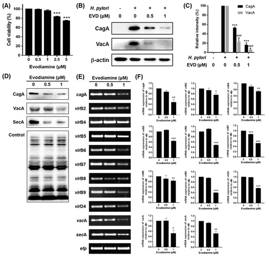 Figure 3. The inhibitory effects of evodiamine on CagA and VacA translocation to the gastric cell line. (A) AGS gastric cancer cells were treated with indicated dose of evodiamine (0.5, 1, 2.5 and 5 μM) for 24 h and cell viability was measured by the WST assay. AGS cells were infected with H. pylori (200 MOI) and treated with indicated concentrations of evodiamine (0.5 and 1 μM) for 24 h. (B) After incubation, the cell lysates were collected and Western blot was then performed to detect CagA and VacA proteins. β-actin was used as an internal control. (C) Each band intensity was normalized to β-actin. H. pylori was treated with indicated concentrations of evodiamine (0.5 and 1 μM) for 72 h. (D) The cell lysates were subjected to Western blot to detect CagA, VacA and SecA. The rabbit anti-H. pylori polyclonal antibody was used as an internal control. (E) RNA was subjected to RT-PCR to detect the mRNA expression level of cagA, T4SS components, vacA and secA. The expression of efp was used as an internal control. (F) Each band intensity was normalized to efp. Data were presented as mean ± SEM of three independent experiments and analyzed by Student’s t-test (### p < 0.001, * p < 0.05, ** p < 0.01 and *** p < 0.001).