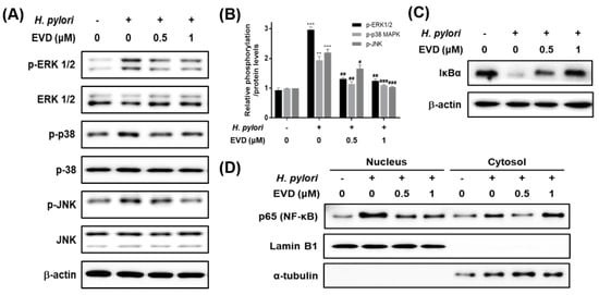 Figure 4. The inhibitory effects of evodiamine on H. pylori-induced activation of MAPK and NF-κB and degradation of IκBα in AGS cells infected with H. pylori. AGS cells were infected with H. pylori (200 MOI) and treated with indicated concentrations of evodiamine (0.5 and 1 μM) for 12 h. (A) After incubation, cell lysates were collected and Western blot analysis of phosphorylated and total ERK 1/2, JNK and p38 was performed. β-actin was used as an internal control. (B) Each band intensity was normalized to β-actin. Data were presented as mean ± SEM. ** p < 0.01 and *** p < 0.001 vs. uninfected control. # p < 0.05, ## p < 0.01 and ### p < 0.001 vs. H. pylori-infected control without evodiamine treatment. (C) Western blot analysis of IκBα was performed. β-actin was used as an internal control. (D) Cell lysates were separated into nuclear and cytosolic fractions, then performed to Western blot for NF-κB. Lamin B1 was used as an internal control for nuclear fraction and α-tubulin was used as an internal control for cytosolic fraction. EVD, evodiamine.