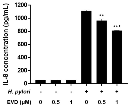 Figure 5. Inhibitory effect of evodiamine on IL-8 secretion induced by H. pylori in AGS cells. AGS cells were uninfected or infected with H. pylori (200 MOI) with indicated concentrations of evodiamine (0.5 and 1 μM). Culture medium were collected after 24 h and ELISA was performed to determine the IL-8 concentration. Data were presented as mean ± SEM of three independent experiments and analyzed by Student’s t-test (** p < 0.01 and *** p < 0.001). EVD, evodiamine.
