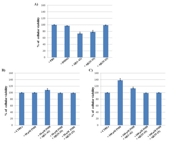 Percentage of cell viability in Olfactory Ensheating Cells (OECs) performed through the 3(4,5-dimethyl-thiazol-2-yl)2,5-diphenyl-tetrazolium bromide (MTT) test. (A) Phosfate buffer saline (PBS) and dimethyl sulfoxide (DMSO) treated OECs, exposed to 10 μM Amyloid Beta (Aβ) Aβ (1-42) or Aβ(25-35) or Aβ(35-25) for 24 h; (B) OECs pre-treated with 50 µM indicaxanthin (INDI) and exposed to 10 μM Aβ(1-42) or Aβ(25-35) or Aβ(35-25) for 24 h; (C) OECs pre-treated with 100 µM INDI and exposed to 10 μM Aβ(1-42) or Aβ(25-35) or Aβ(35-25) for 24 h. Data were statistically analyzed by using one-way analysis of variance (one-way ANOVA) followed by post-hoc Holm–Sidak test, in order to calculate significant differences among groups. Data reported represent the mean ± S.D. of five separated experiments in triplicate. * p < 0.05 significant differences vs. controls.