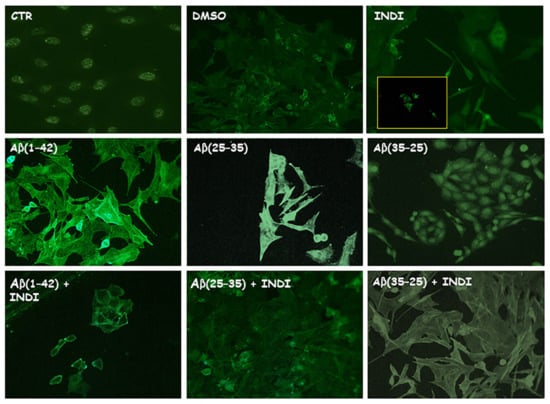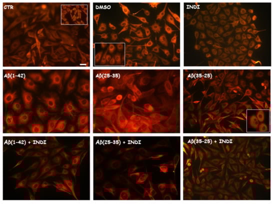 Immunocytochemistry for anti Nestin in OECs. Images show different conditions: control, DMSO, 100 µM Indicaxanthin (INDI), 10 μM Aβ(1-42) or Aβ(25-35) or Aβ(35-25) both in the absence and presence of 100 µM INDI for 24 h. Scale bar 20 µm.