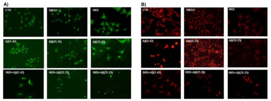 To monitor the intracellular oxidative status, the staining of total intracellular ROS levels (Figure 4A, green) and O2− (Figure 4B, red) generation in OECs exposed for 24 h to the full native peptide Aβ(1-42) or to the fragment Aβ(25-35) or to Aβ (35-25), both in the absence and presence of indicaxanthin, was assessed. Aβ treatment induced a significant increase in total ROS and O2− levels when compared with the controls. No significant change was found in total ROS and O2− production in Aβ(35-25) and indicaxanthin alone exposed cells. The OEC pre-treatment with indicaxanthin and the subsequent exposure to Aβ(1-42) or to Aβ(25-35) or to Aβ(35-25) induced a strong reduction of both the total intracellular ROS and O2− levels. These findings highlighted that Aβ(1-42) and Aβ(25-35) increased the levels of total ROS and O2− production and that indicaxanthin pre-treatment was able to restore the oxidative status modified by Aβ to the control values, reducing prevalently O2− generation.