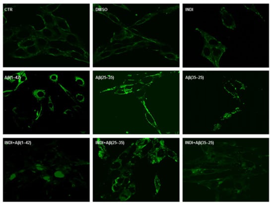 Confocal laser scanning microscopy of labeling immunocytochemistry for anti-TG2 in OECs. Images show different conditions: control, DMSO, 100 µM indicaxanthin (INDI), 10 μM Aβ(1-42) or Aβ(25-35) or Aβ(35-25) both in the absence and presence of 100 µM INDI for 24 h. Scale bar 20 µm.